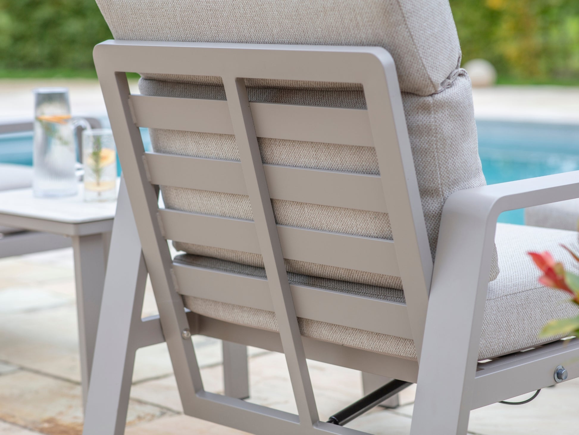 Each sofa style chair reclines smoothly to extend your comfort zone, while the separate footstools let you kick back and unwind fully. The included Sinterstone side table adds a refined surface for drinks, books or snacks—its robust build designed for outdoor durability.