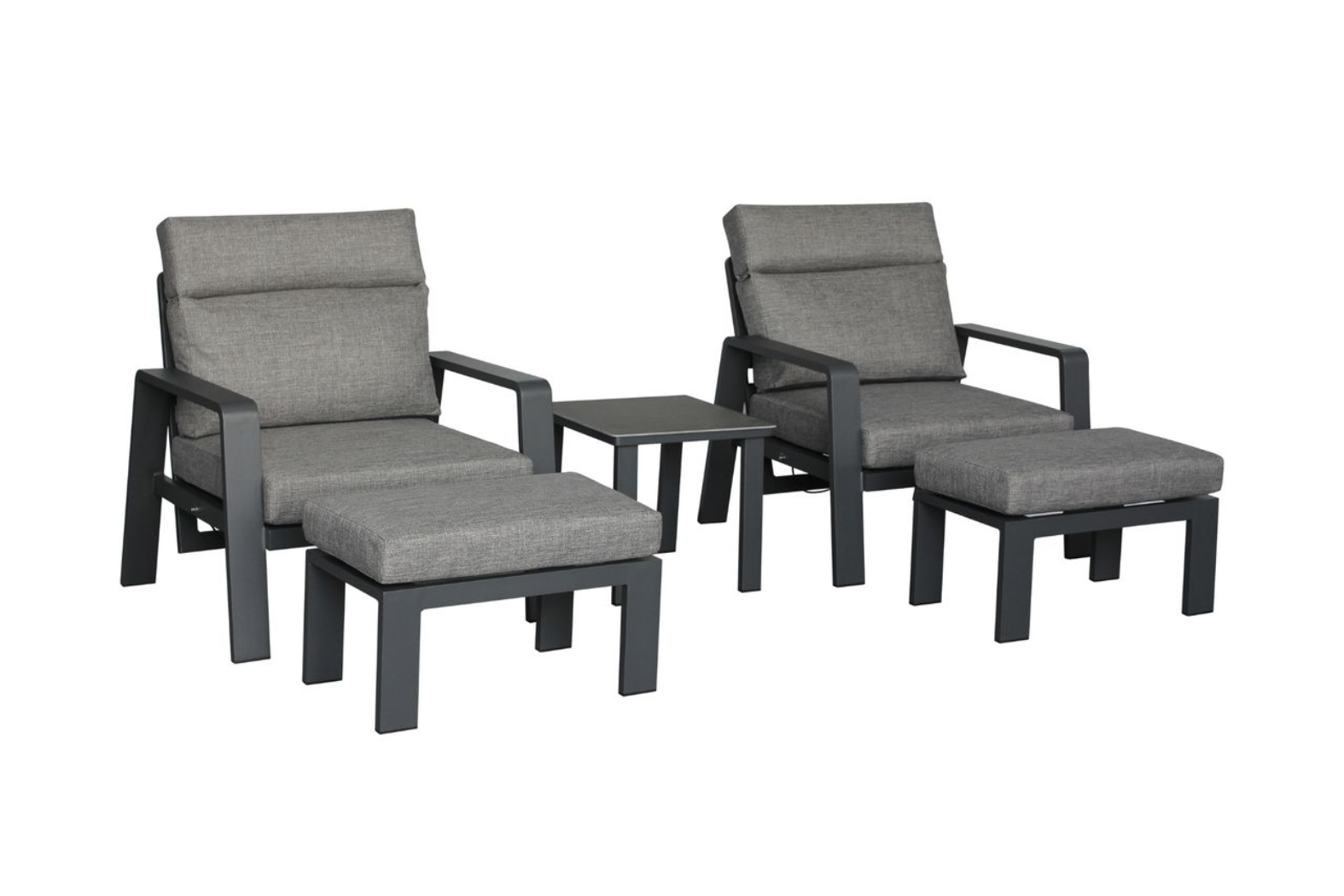 Each sofa style chair reclines smoothly to extend your comfort zone, while the separate footstools let you kick back and unwind fully. The included Sinterstone side table adds a refined surface for drinks, books or snacks—its robust build designed for outdoor durability.